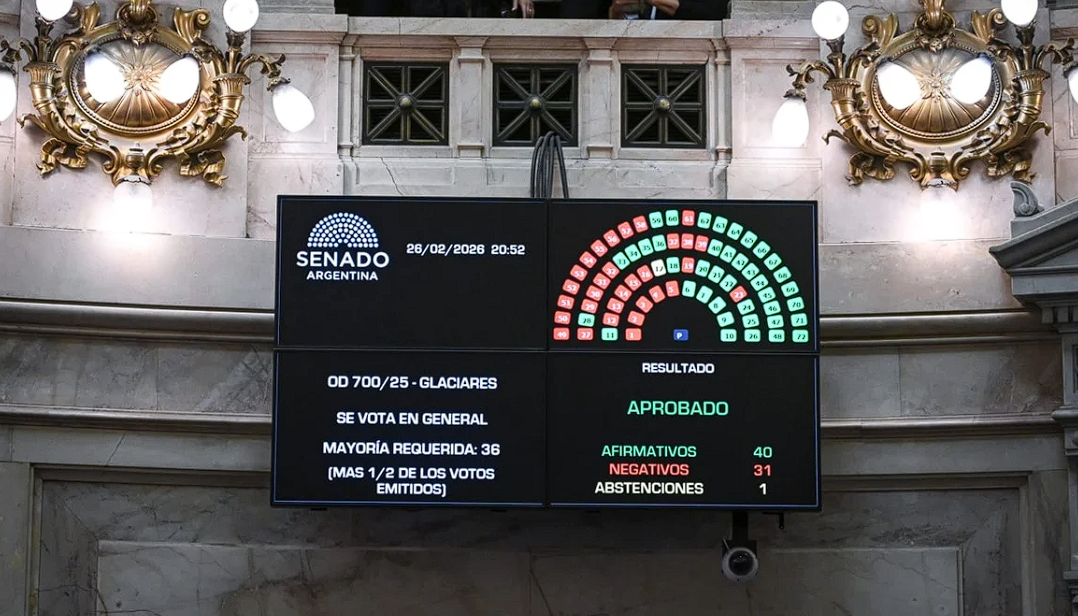 Tras varias horas de debate, la Cámara alta dio luz verde a la iniciativa impulsada por el Poder Ejecutivo, que introduce cambios en el régimen de protección de los glaciares y del ambiente periglacial. La votación dejó en evidencia la solidez de la mayoría oficialista, que logró reunir los apoyos necesarios para avanzar con una de las reformas centrales en materia de recursos naturales.